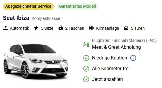 Egal, ob Sie die Küstenstraßen entlangfahren, durch Lorbeerwälder schlängeln oder zum höchsten Gipfel der Insel aufbrechen – mit einem Mietwagen entdecken Sie Madeira auf Ihre ganz eigene Weise.Bereit für Ihr Inselabenteuer? Finden Sie jetzt Ihren idealen Mietwagen und starten Sie die Reiseplanung!